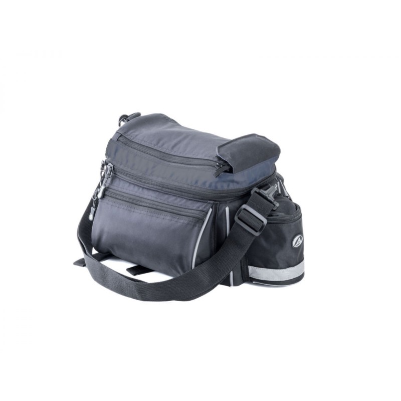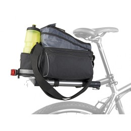 Torba na bagażnik tylny wykonana z materiału odpornego na działanie wody. Mocowana do bagażnika paskami z rzepem. Podwójne ścianki usztywnione gąbką techniczną. Komora główna zapinana na dwa zespolone zamki i rzep. Dwie kieszenie boczne zapinane na zamek, kieszeń tylna na bidon. Przypinany karabinkami pasek do noszenia na ramieniu. Z tyłu odblaskowa taśma zwiększająca bezpieczeństwo jazdy. Pojemność: 7-9 l. Wymiary: 28 x 14 x 17 cm. Kolor: czarna.